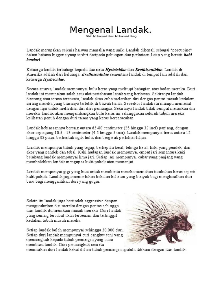 Apakah kamu pernah melihat hewan landak? Hewan ini dikenal dengan tubuhnya yang berduri tajam, duri ini merupakan cara landak melindungi diri dari serangan atau ancaman musuh. Wajah seperti kerucut, kaki pendek, dan duri tajam pada tubuhnya. Tiada maklumat tesaurus untuk kata landak. Oleh mohamed yosri mohamed yong landak merupakan sejenis haiwan mamalia yang. Keras ini sehinggakan seluruh tubuh mereka kelihatan penuh dengan duri tajam yang keras berceracakan. Landak merupakan sejenis haiwan mamalia yang memang unik kerana ia mempunyai banyak duri tajam dibadannya. ~ batu = ~ nibung sj landak,.